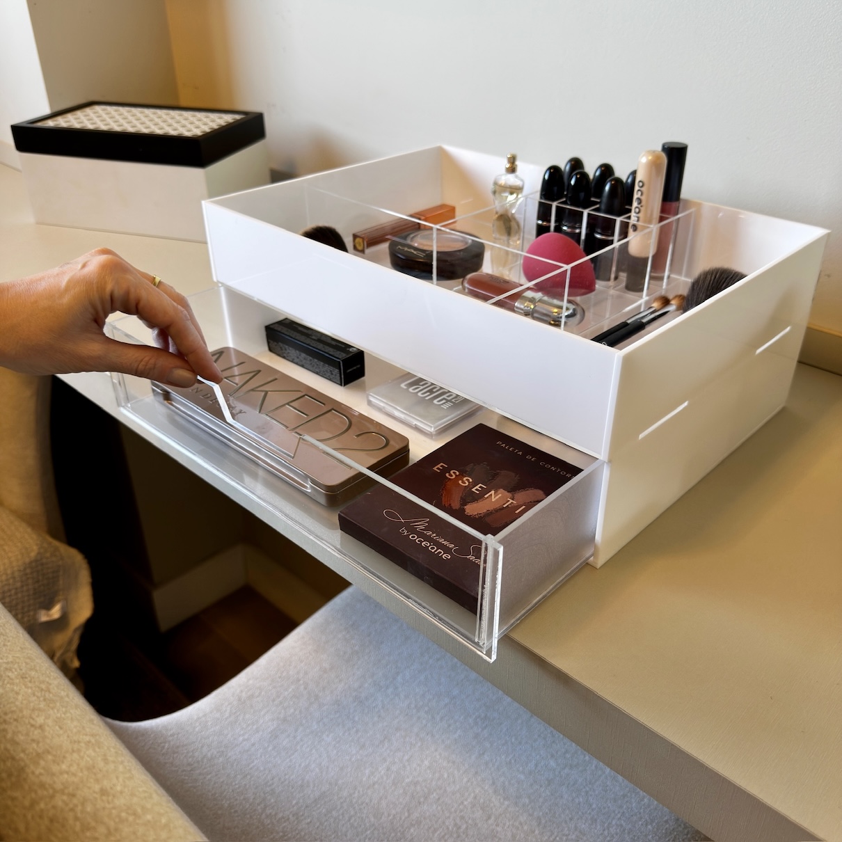 Esta caixa de maquiagem completa não apenas organiza, mas também eleva o ambiente onde é colocada. Seu design elegante e moderno em acrílico transparente não só valoriza suas preciosidades de beleza, mas também adiciona um toque de glamour à sua penteadeira ou área de maquiagem.